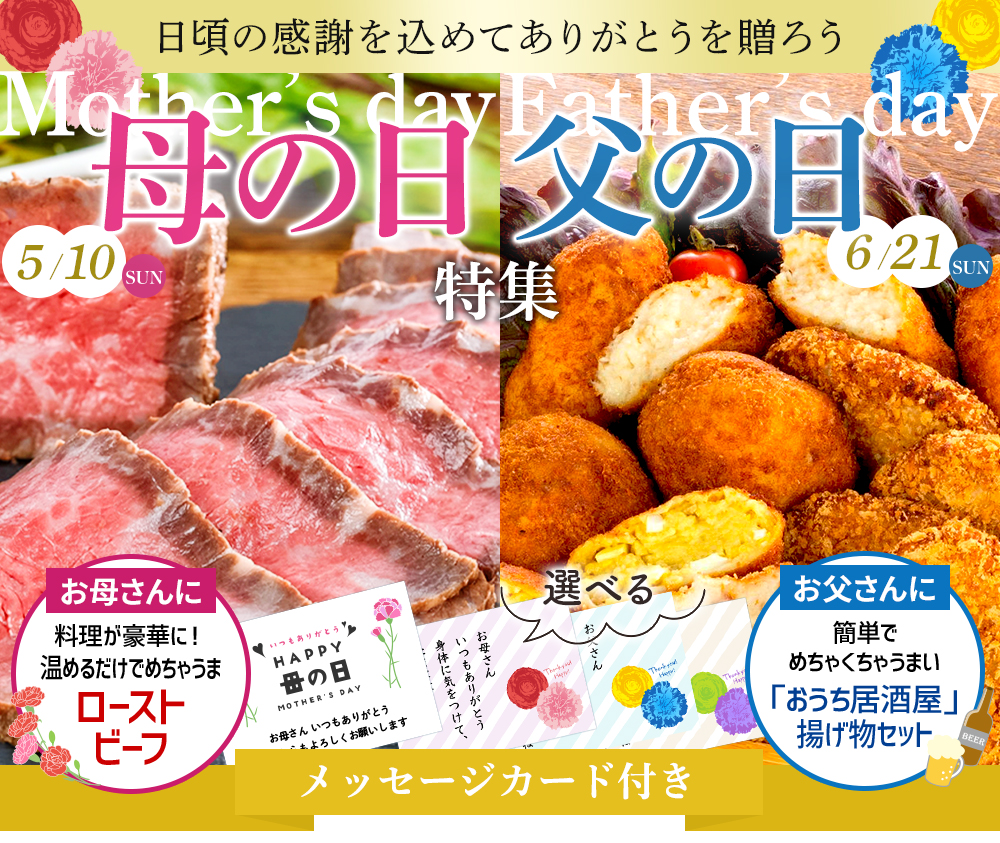他の画像を見る 5/11(日)母の日・6/15(日)父の日 【母の日・父の日ギフト】 【選べる!】広岡精肉店特製揚げ物・惣菜セット【コロッケ カツ ハンバーグ ローストビーフ 焼豚 精肉】 送料無料 クール便でお届け 当店特別価格 ¥ 5,400 税込 詳細を見る お気に入りに登録する