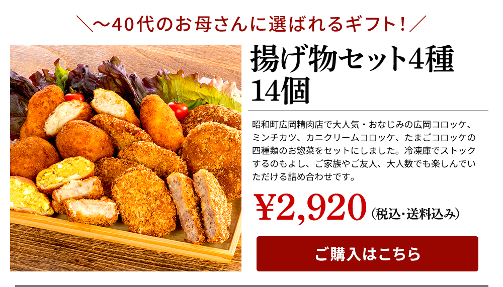 他の画像を見る 5/11(日)母の日・6/15(日)父の日 【母の日・父の日ギフト】 広岡精肉店特製フライ4種14個セット詰め合わせ【ギフト可】【コロッケ メンチカツ カニクリームコロッケ 玉子コロッケ】 送料無料 クール便でお届け 当店特別価格 ¥ 2,920 税込 詳細を見る お気に入りに登録する