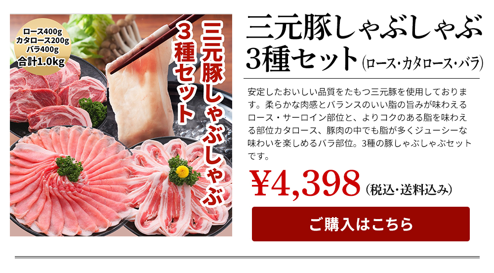他の画像を見る \春ギフト、新生活のお祝いに/安定した美味しさ、国産三元豚 三元豚しゃぶしゃぶ3種セット(ロース・カタロース・バラ) 1kg 送料無料 クール便でお届け 当店特別価格 ¥ 4,398 税込 詳細を見る お気に入りに登録する