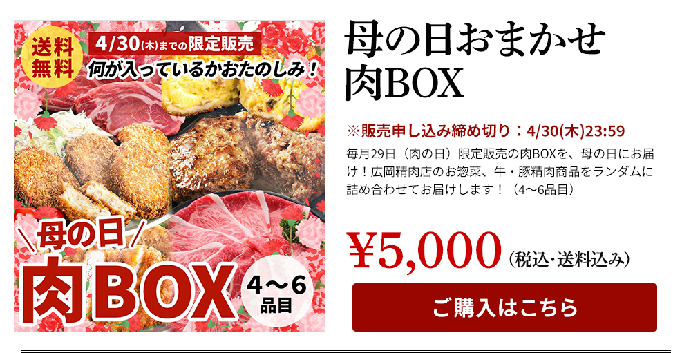 他の画像を見る \4月30日まで限定販売/中身は届いてからのお楽しみ!☆ギフトに人気の商品セレクトです☆ 母の日 おたのしみ肉BOX【揚げ物 惣菜 ハンバーグ 精肉 詰め合わせ 送料無料】 送料無料 クール便でお届け 当店特別価格 ¥ 5,000 税込 販売期間 2026/04/01 0:00 〜 2026/04/30 23:59 詳細を見る お気に入りに登録する