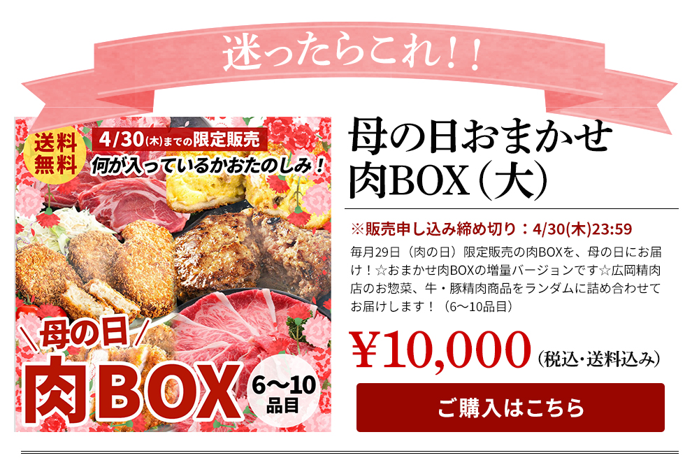 他の画像を見る \4月30日まで限定販売/中身は届いてからのお楽しみ!☆ギフトに人気の商品セレクトです☆ 母の日 おたのしみ肉BOX(大)【揚げ物 惣菜 ハンバーグ 精肉 詰め合わせ 送料無料】 送料無料 クール便でお届け 当店特別価格 ¥ 10,000 税込 販売期間 2026/04/01 0:00 〜 2026/04/30 23:59 詳細を見る お気に入りに登録する